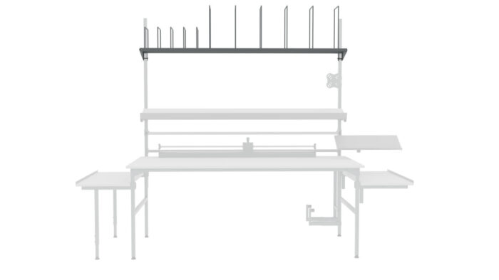 Półka na kartony do stołu 120×30 cm RA Construction to kompaktowe i praktyczne rozwiązanie dla stanowisk pakowania i wysyłki, pozwalające na łatwe przechowywanie kartonów bezpośrednio nad blatem roboczym.