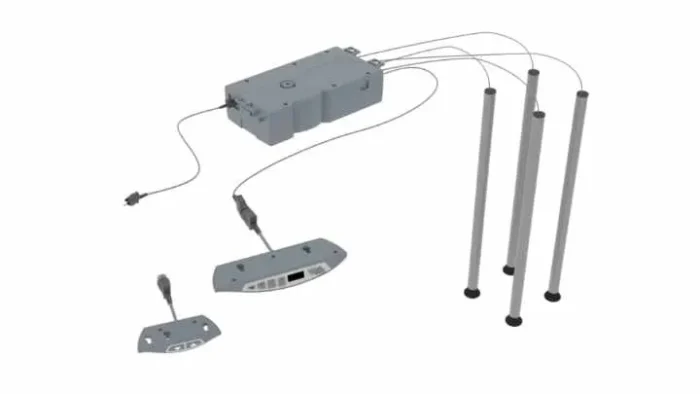 Rozwiązanie wykorzystuje siłowniki elektromechaniczne, które działają cicho, bez hydrauliki i płynów roboczych. Wystarczy nacisnąć przycisk na pilocie, a sterownik SCT4 automatycznie i równomiernie podniesie lub opuści blat stołu.