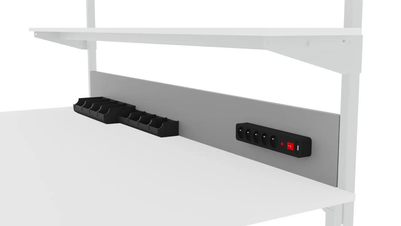 Ścianka zabezpieczająca do stołu RA Construction to praktyczne rozwiązanie, które pozwala zabezpieczyć elementy znajdujące się na blacie przed przypadkowym zsunięciem oraz umożliwia zamocowanie dodatkowych akcesoriów i pojemników magazynowych w zasięgu ręki.