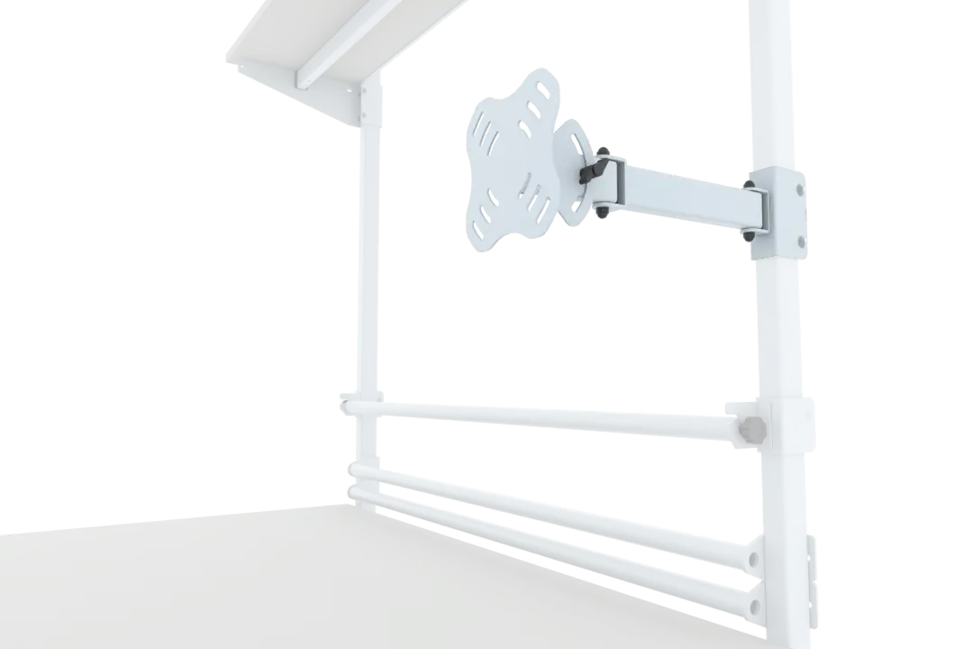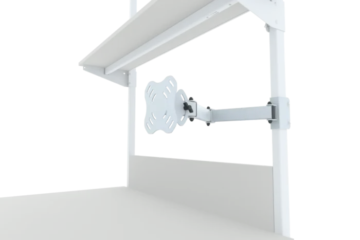 Dzięki zastosowaniu przegubów (1, 2 lub 3), uchwyt zapewnia szeroki zakres regulacji i pozwala na optymalne ustawienie ekranu względem użytkownika. Konstrukcja umożliwia montaż zarówno na wspornikach pionowych stołu, jak i na perforowanej ścianie narzędziowej.