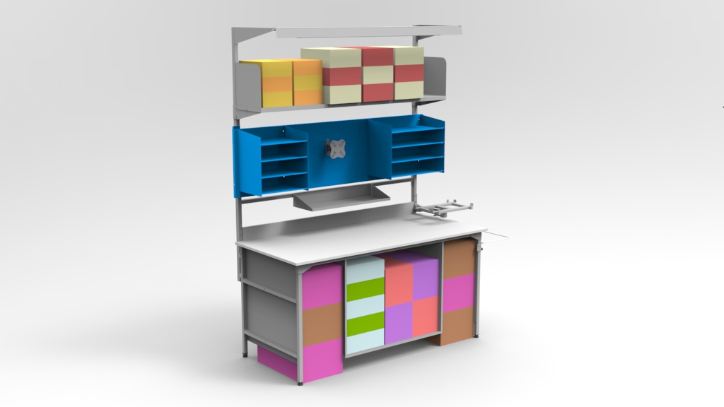 Pod blatem znajdują się półki na kartony w 5 typowych rozmiarach obuwniczych, uchwyt na odpady oraz obudowa boczna, które utrzymują porządek.