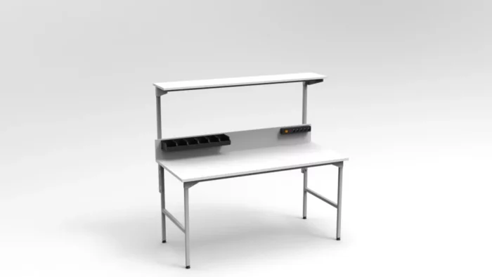 Solidna konstrukcja z profili stalowych 30 × 30 × 2 mm zapewnia udźwig 300 kg, a blat z płyty laminowanej 25 mm z obrzeżem ABS 2 mm wytrzymuje intensywne użytkowanie. Nadbudowa o wysokości 1000 mm została wyposażona w półkę 300 mm (z możliwością regulacji wysokości) oraz tylną ściankę 200 mm, która chroni elementy i przewody.