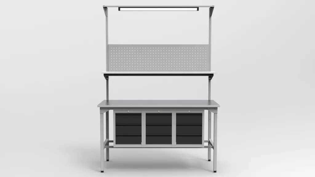 Nad blatem znajduje się nadbudowa z perforowaną ścianką narzędziową oraz oświetleniem centralnym LED z przełącznikiem, które zapewnia równomierne światło na całej powierzchni roboczej.