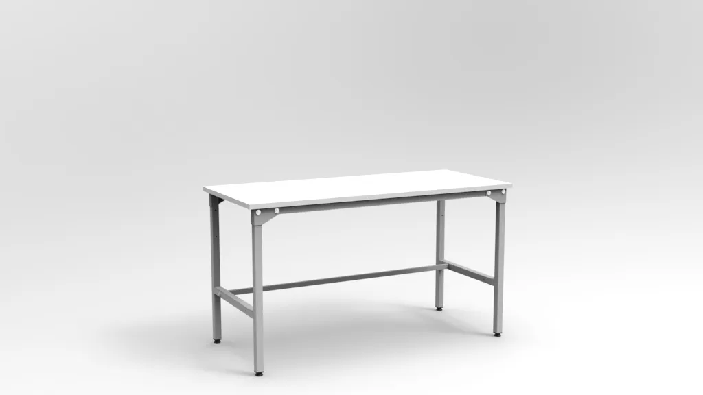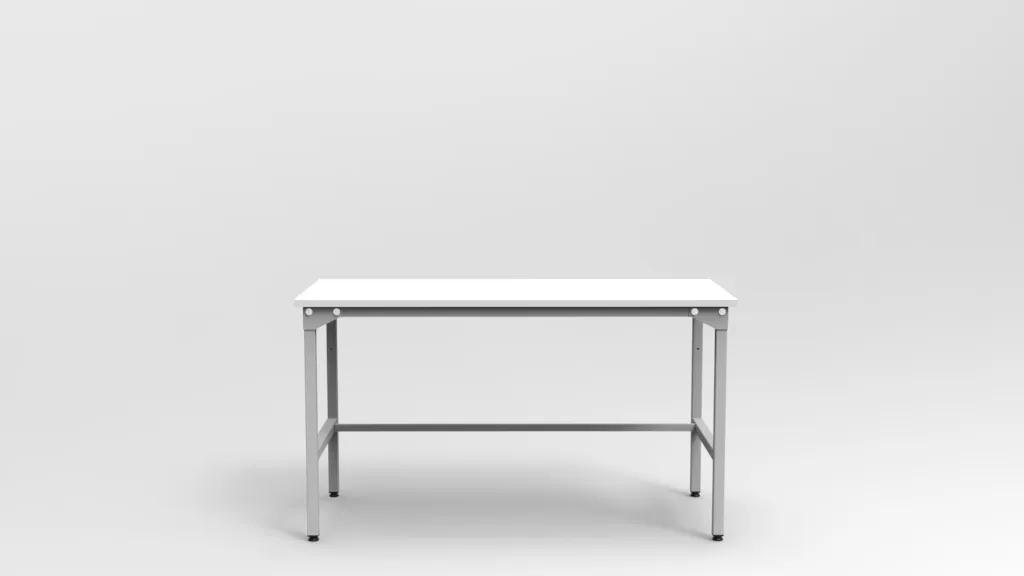 - Blat: płyta wiórowa 25 mm w klasie E1, laminat HPL, obrzeże ABS 2 mm – odporny na oleje i kleje; możliwość pokrycia blachą (1,5–4 mm), filcem technicznym lub gumą NBR.