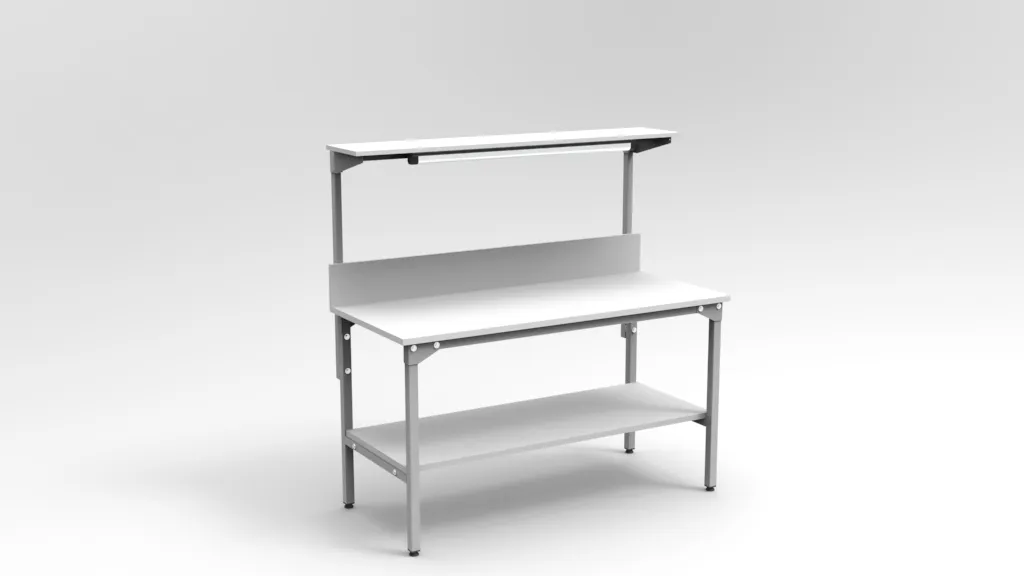 Nadbudowa o wysokości 1000 mm wykonana z profilu 40 × 30 × 2 mm posiada półkę prostą o głębokości 300 mm oraz wbudowane oświetlenie LED (30/40/70 W zależnie od szerokości stołu). Dodatkowa półka dolna (głębokość 590 mm, nośność 100 kg) zapewnia miejsce na cięższy sprzęt lub zapasowe części.
