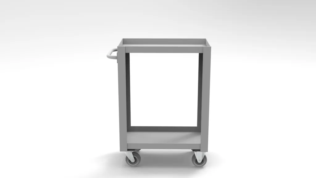 Kompaktowy wózek magazynowy dwupółkowy do transportu i odkładania drobnych elementów. Idealny do warsztatów, magazynów i działów pakowania.