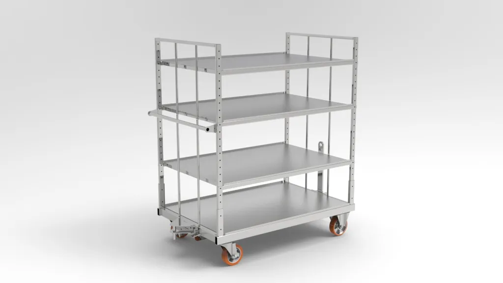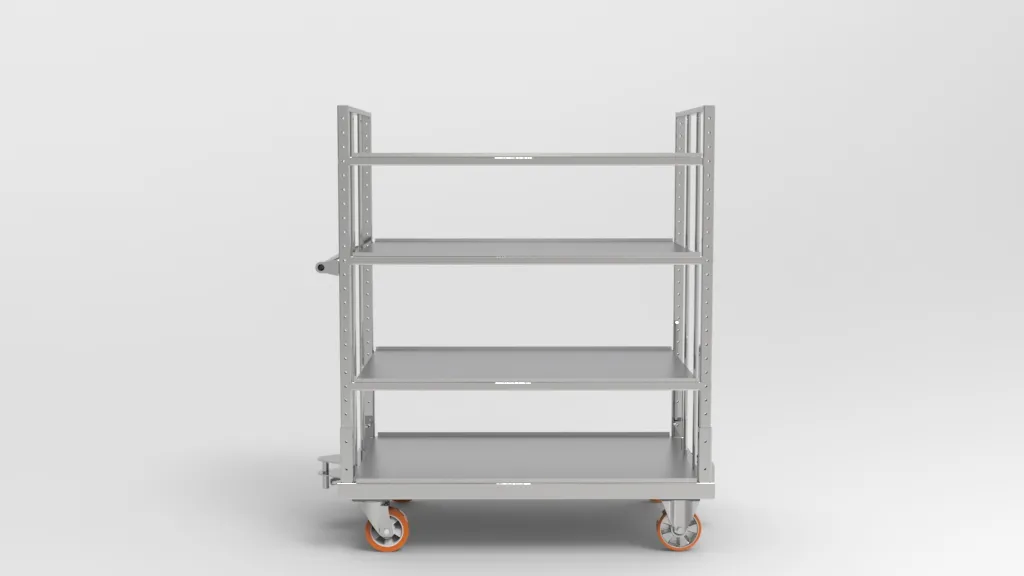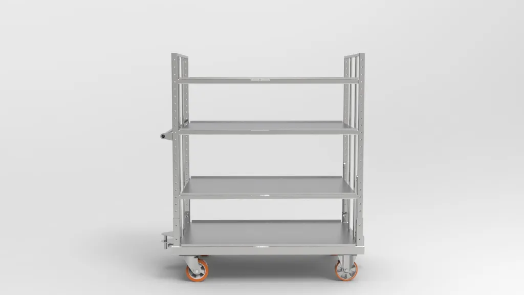 RC-S023_R01120922 to wytrzymały wózek magazynowy klasy przemysłowej, zaprojektowany z myślą o ergonomii i bezpieczeństwie w transporcie wewnętrznym. Konstrukcja z ocynkowanych profili stalowych i półek z blachy o grubości 1,5–2 mm zapewnia niezawodność nawet przy pełnym obciążeniu do 500 kg.